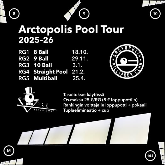 Tervetuloa Arctopolis Pool Tourin toiseen osakilpailuun. Lajina 9-pallo.